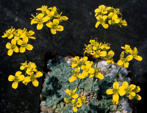 Draba longisiliqua - a striking dwarf species from limestone cliffs of Caucasus. I cultivate it as a pot plant in the frame.