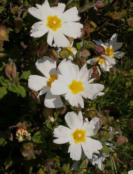 Cistus salvifolius – This is a white flowered shrub with soft, sage like, stalked leaves which are not sticky and hardly aromatic. It is found in woods, thicket, often on acid soil.