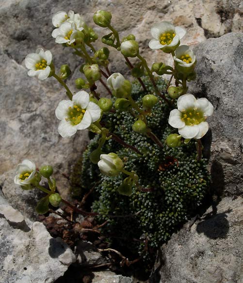 Saxifraga squarosa – This charming little plant makes congested hard hummocks of very small rosettes. It is found amongst screes and limestone rocks in South-eastern Alps.