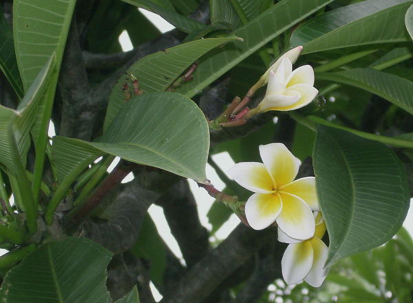 Plumeria acutifolia - Plumeria has spread to all tropical areas of the world. Plumeria flowers are most fragrant at night in order to lure sphinx moths to pollinate them.