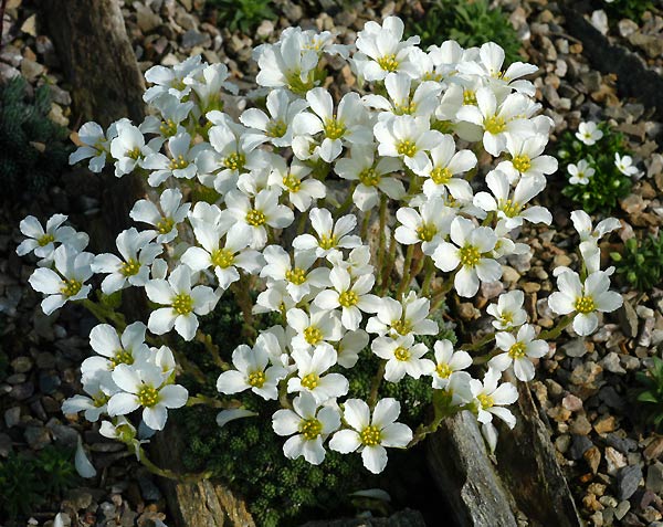 Saxifraga tombeanensis – This beautiful species grows in the Italian Alps on Monte Baldo and Cima Tombea. It grows without difficulty in a stone trough. Hardy and spring flowering.